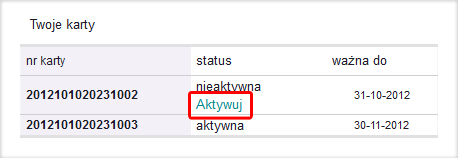 Moje konto kliknij link Aktywuj przy numerze wybranej karty.